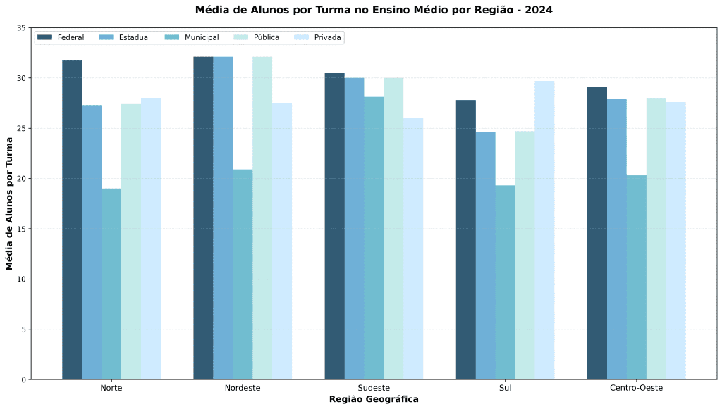 Ao comparar redes públicas e privadas dentro de cada região, a desigualdade se torna ainda mais evidente. Na maioria delas, a rede privada mantém turmas menores, enquanto as escolas públicas lidam com números significativamente maiores. No Nordeste e no Norte, essa diferença é especialmente marcante: enquanto as escolas públicas chegam a superar 32 alunos por turma, a rede privada mantém médias mais baixas, variando entre 26 e 28.