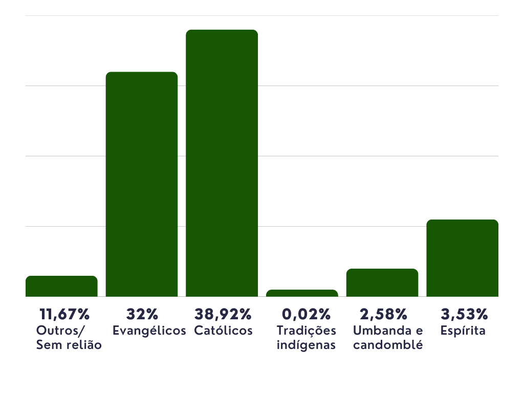 A religião molda grande parte do imaginário brasileiro e está presente no cotidiano da maioria das famílias. Segundo o Censo do IBGE de 2022, aproximadamente 90,55% da população brasileira declara ter uma religião.